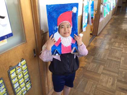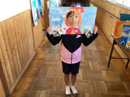 図工「顔を出したらなんだかわくわく」の作品です。素材を生かした作品ができました。