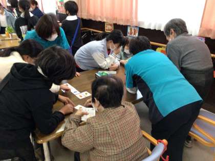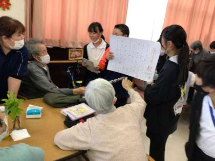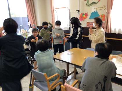 ふじのさと訪問2回目 その1 公開日 2024/11/27 更新日 2024/11/27 第6学年の様子 前回の訪問から2週間が経ち、ふりかえりをもとに再度計画し、2回目の訪問をしました。 利用者の方との交流が微笑ましかったです。 1班はけん玉などの昔遊びとお絵描き、2班はクイズ、3班はオセロやトランプなどです。 6年