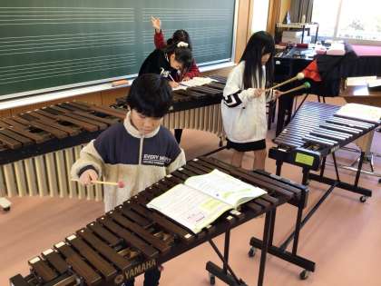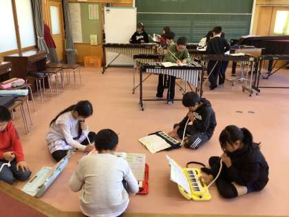リコーダーや鍵盤ハーモニカ、鉄琴や木琴を使って「茶色の小びん」を合奏します。今日は楽器ごとに分かれて譜読みをしました。それぞれのパートが演奏するフレーズが違うので、他の旋律に惑わされないように練習していました。