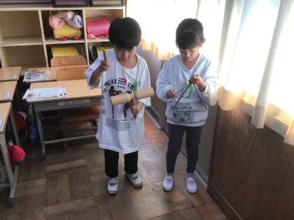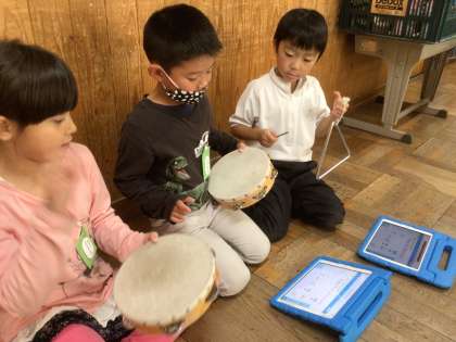 12/2 音楽「音を繋げて音楽をつくろう」(1年) 公開日 2024/12/02 更新日 2024/12/02 第1学年の様子 絵から見つけた音を3人グループで合わせて音楽を作ります。1人3回鳴らしますが、どんな順番で鳴らすかをグループで相談して作りました。
