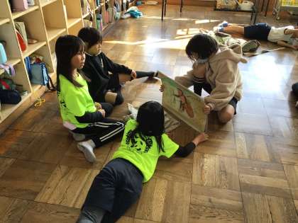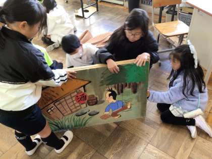 総合の時間の様子です。「飯野の昔」というキーワードからスタートした総合の学習。今度は地域の昔話にスポットを当てて学習していきます。まずはじめは、グループに分かれて紙芝居を読んでみるところからスタートしました。読めない漢字や聞いたことない言葉に苦戦しながら読む練習をしています。