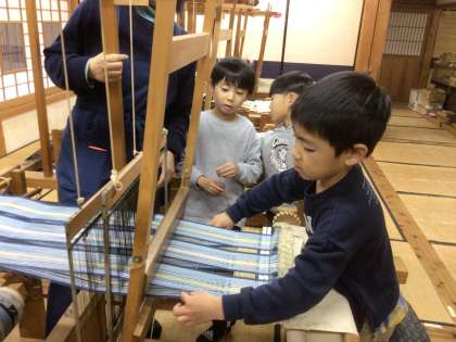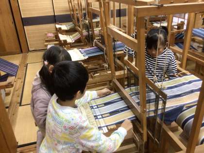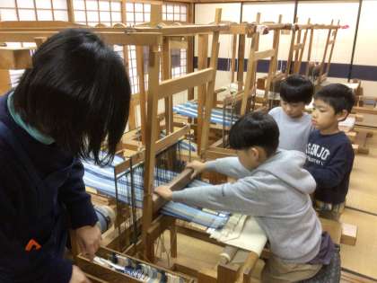 お弁当の後は足助屋敷へ移動し、グループ毎に体験活動です。はた織りは、コースターを作りました。