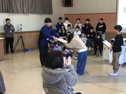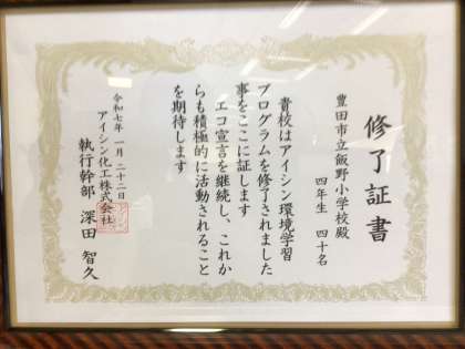 1/22 4年生 エコ博覧会6 公開日 2025/01/22 更新日 2025/01/22 校長室から 最後にアイシン化工様から修了証と記念品をいただきました。 1年間、充実した学習に取り組めました。 校長