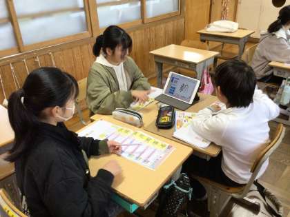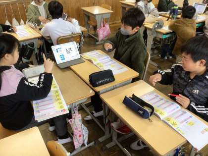 5年生では新出漢字の書き順をタブレットで確認する勉強をしていました。