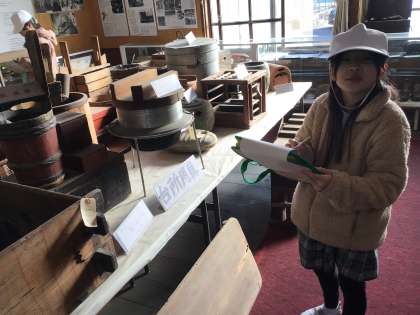 昔の生活用具を見学しました。「うどんつくり器」に大興奮です。