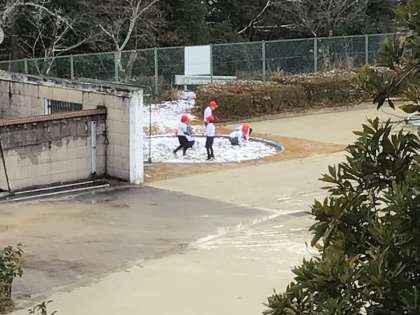 1年生が砂場に残っている雪で雪合戦を楽しんでいました。