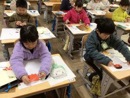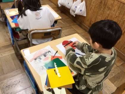 2/5 図工「紙版画」(1年) 公開日 2025/02/05 更新日 2025/02/05 第1学年の様子 紙版画に挑戦しています。使いたい色の紙に下絵を描き、切って台紙に貼ります。完成までもう少しかかりそうです。