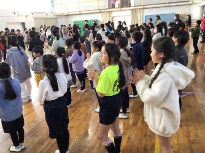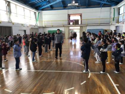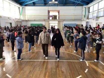 6年生と在校生とお別れの会を開きました。 3年生が6年生の様子を伺っていました。