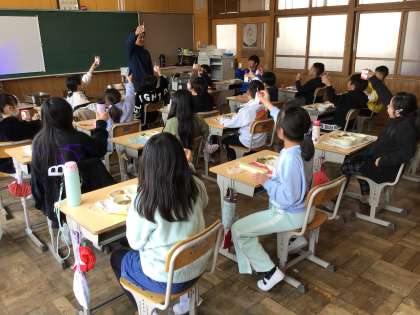 4年生の教室では、担任の先生が音頭をとり、牛乳でお別れの乾杯をしました。
