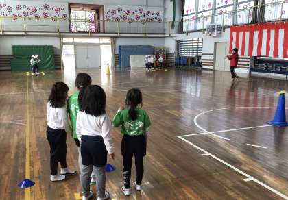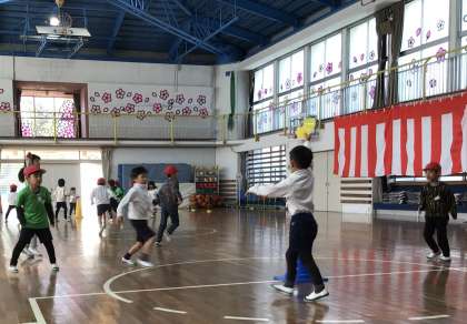 お楽しみ会前半は、体育館で「スポーツ鬼ごっこ」と「だるまさんが転んだ」を行いました。