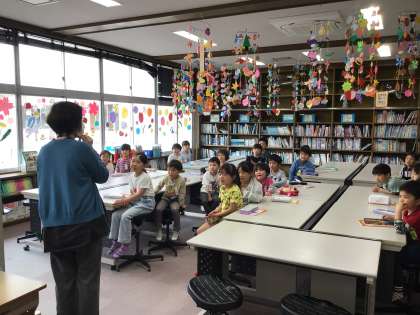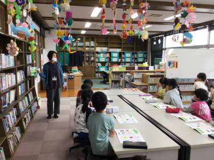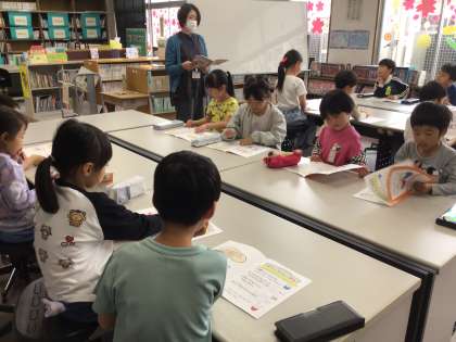 図書館司書の先生に、図書室の使い方を教えていただきました。まず、飯野小学校図書室の本を借りる時のルールや、本の扱い方を「どくしょノート」を使って学習しました。