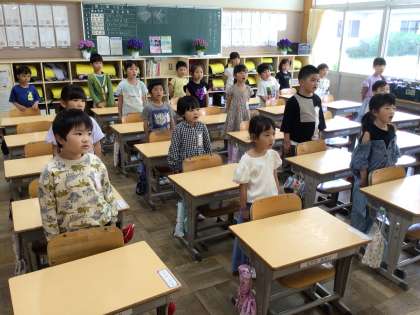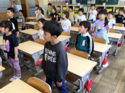 1年生が朝の学習の時間に校歌を練習しました。 先生が示す歌詞を追いかけながら歌いました。