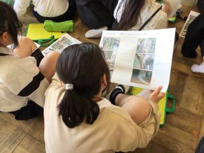 今年度総合では「森」を大きなテーマに1年間活動していく予定です。身近な木である運動場の木を調べました。普段景色だった木を改めてよく見ると、面白い模様や木の高さに驚く姿が見られました。