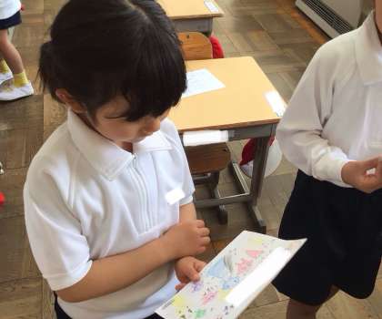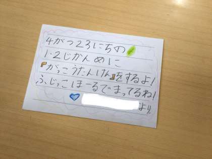 4/22 耳の検査から教室に戻ったら…(1年) 公開日 2025/04/22 更新日 2025/06/20 第1学年の様子 保健室で耳の検査をして教室戻ったら、机の上に何か置いてありました。2年生から、明日の学校探検の招待状でした。みんな大喜び!嬉しそうです。明日が楽しみですね。 1年