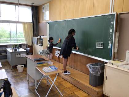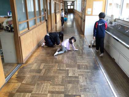 上級生が下級生の手本となり、丁寧に掃除しています。
