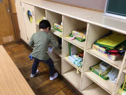 片付けをしないと、どんなことが困るのかをみんなで考えた後、自分のロッカーや道具箱がきちんと片付いているか確認し、整理整頓しました。終わった後、感想を聞くと、「スッキリした」「気持ちいい」という意見がたくさん出ました。いつもスッキリ気持ちの良い1年生の教室にしたいですね。