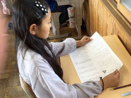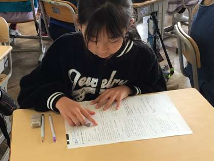 先生の指示に従って、文章を指で指して、答えが書いてある部分を見つける練習です。