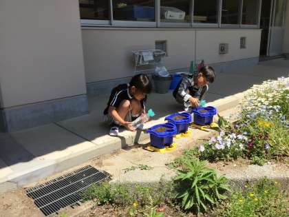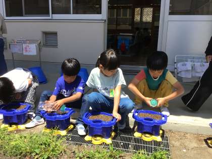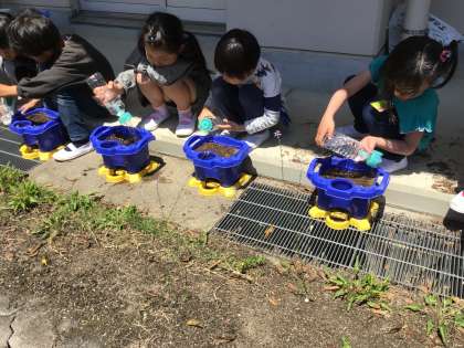 最後にお水をたっぷり優しくかけて完了です。いつ芽が出てくるかな?と聞いたところ、「明日!」「6月!」「1年後!」など様々な予想が出ました。芽が出るのを楽しみに、明日から毎日水やりのお世話をがんばりましょう。