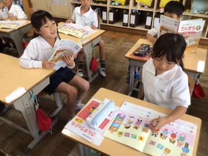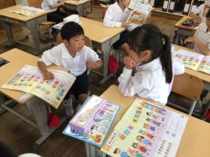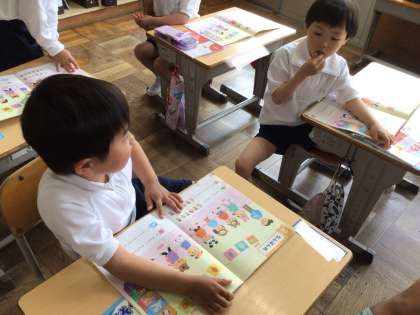 算数では「なんばんめ」の学習をしています。ペアのお友達同士で、問題を出し合いました。