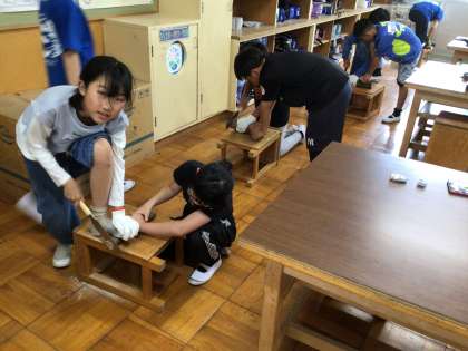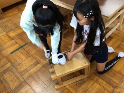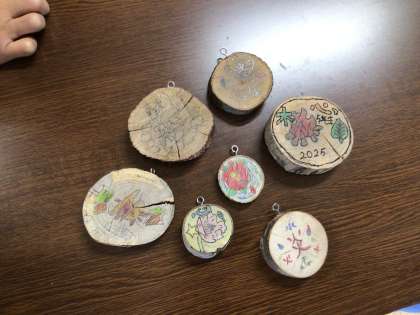 飯野小学校の木を使ったオリジナルキーホルダーです。各教室に掲示していますので、授業参観の際にご覧ください。