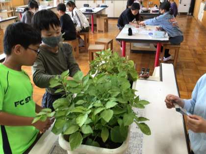 育てていただいたジャガイモをつかって、日光によって養分(でんぷん)がつくられるか実験します。葉にアルミホイルをかぶせ、実験準備完了です。