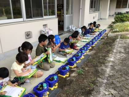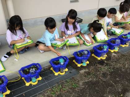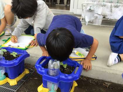 5/8に蒔いたあさがおの芽が出ました。今日は、芽の観察です。目で見るだけではなく、手で触ってみたり、匂いを嗅いでみたり、五感を使ってじっくり観察し、記録しました。