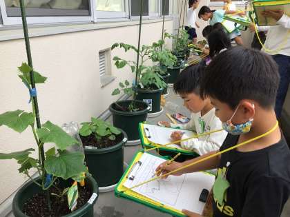 色や触感などに注目して、夏野菜を観察しました。教科書では「わたしのむねくらいの高さ」というように大きさを表現していましたが、算数で長さの表し方を勉強したので、ものさしで長さを測って「cm」で記すことができていました。