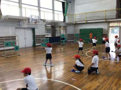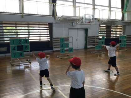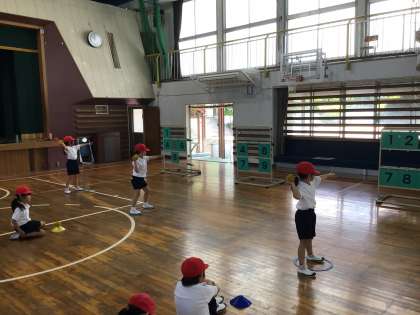 5/28 体育「ストラックアウト」(1年) 公開日 2025/05/29 更新日 2025/06/20 第1学年の様子 今日は、チームごとにどれだけ的を倒せるかに挑戦しました。1回目が終わった後、どうすれば的を倒すことができるか、思い付いたことを発表しました。友達の発表した工夫を意識して投げたら、2回目は1回目よりたくさん倒すことができました。 1年