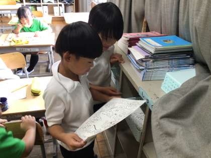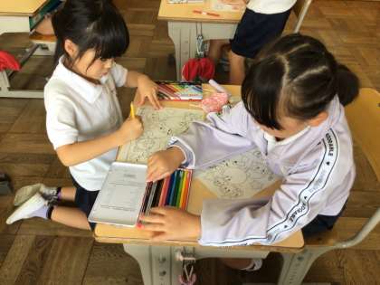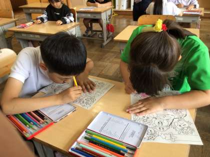 給食の時間に、5年生のぬりえ会社からぬりえのプレゼントがありました。食べ終わった子から早速遊び始め、午後業間も遊んでいました。うれしいプレゼントです。
