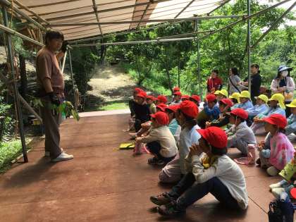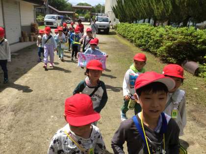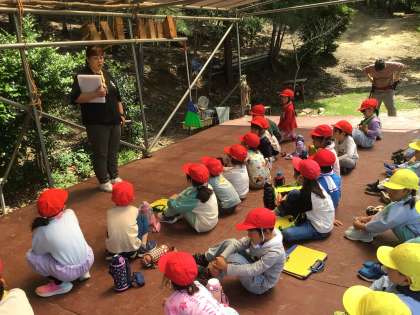 先日、小学校の見学に来てくれた飯野ひかり幼稚園の年長さんと仲良くなるために、今日は、飯野ひかり幼稚園に出かけました。まずは、園長先生や主任先生から、山で遊ぶときの注意点や今日の活動内容の説明を聞きました。