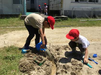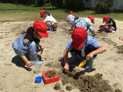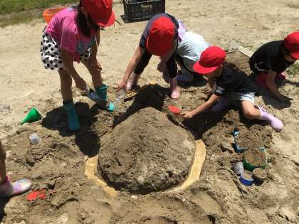 砂や土を使った造形活動をしました。友達と一緒に作る子、一人で作る子、泥だらけになりながら思い思いの作品を作りました。長靴や着替えの用意ありがとうございました。