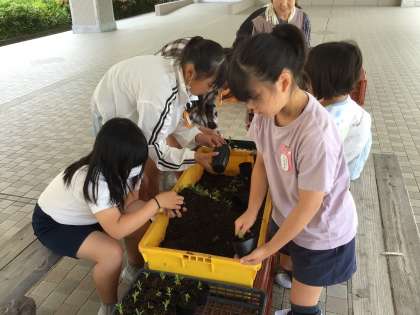 6人の花ボランティアさんと一緒に、苗をビニルポットに植え替えました。