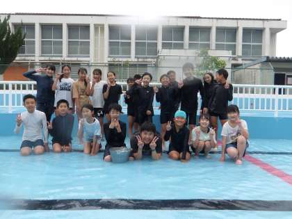 掃除が終わって、水がないプールではいチーズ!