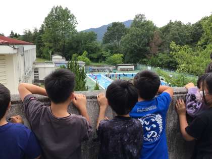 階段から6年生のプール掃除の応援に行きました。来年はわたしたちの番ですね。