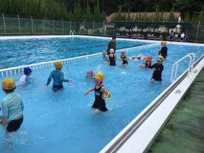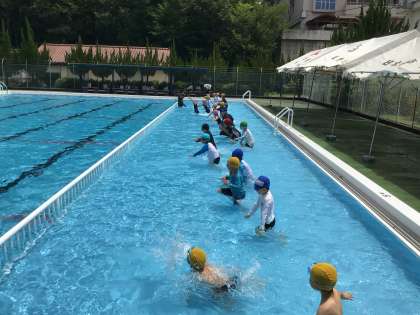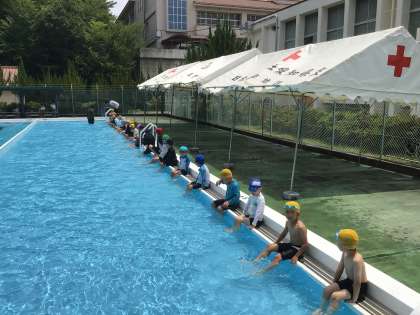 今週から体育の授業は、天気や水温など条件が合えば水遊びの学習を行います。今日は、小学校で初めてのプールです。水かけっこや、洗濯機、輪っか取りなどをして、水に慣れました。