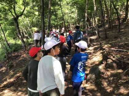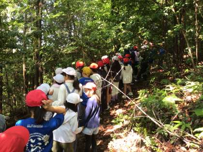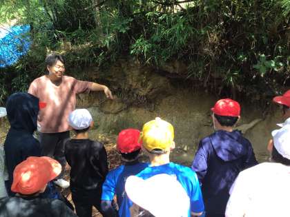 実際に森を探索しました。自然林と人工林も実際に見ることができました。道中、イノシシのお風呂も見せていただきました。