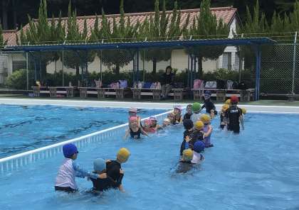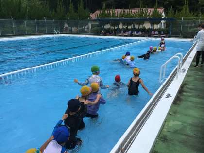 2回目の水泳学習です。今日は、とても気温も水温も高く、絶好のプール日和でした。水中でじゃんけん列車をしました。