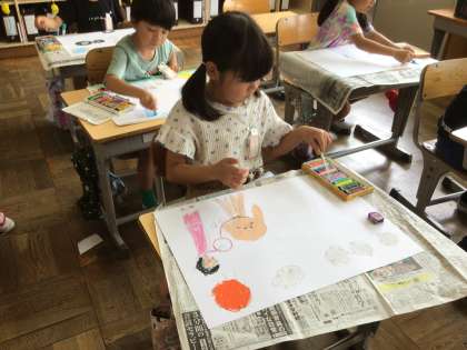 「学校や家でしたことや思ったことを絵に描いて先生に教えてね。」というテーマです。今日は、小学校で初めて四つ切り画用紙に描きました。どんなことを教えてくれるのか、完成が楽しみです。