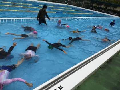 浮かんだり泳いだりして遊びながら、水中で動く練習をしています。