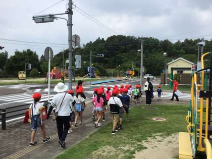 午前中、1年生が豊田市交通安全学習センターに出かけ、歩道の歩き方や横断歩道の渡り方を覚えました。
