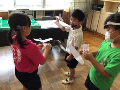 夏休み明けからの生活科の授業では、おもちゃ作りに挑戦しています。今日は少し難しい「ストローひこうき」を作りましたが、説明をよく聞いて上手に作ることができました。その後作ったおもちゃで遊びましたが、もっと遠くに飛ばすために造りを調整したり、飛ばし方のコツを考えたりしていました。