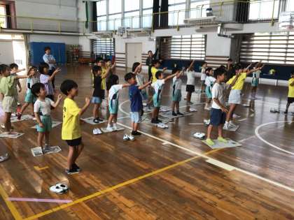 9/8 1年 園のお友達と仲良くなろう「新聞じゃんけん」 公開日 2025/09/08 更新日 2025/09/08 第1学年の様子 1つ目のお楽しみは「新聞じゃんけん」です。校長先生や園の先生たちともじゃんけんしました。小さくなった新聞紙にバランスを取って落ちないように頑張った子もいれば、じゃんけんに強くて新聞が大きいままの子もいました。 1年
