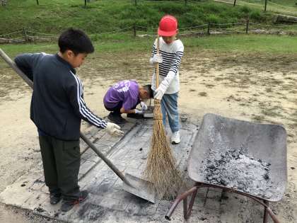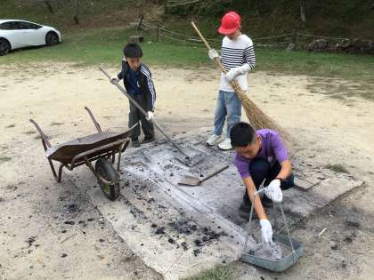 校長先生と3人の児童が昨日のキャンプファイアの後片付けをしました。