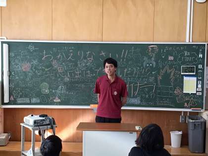 黒板は在校生からの「お帰りなさい」のメッセージで埋まっています。