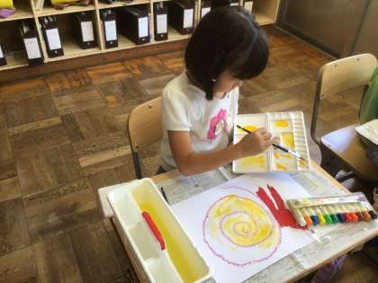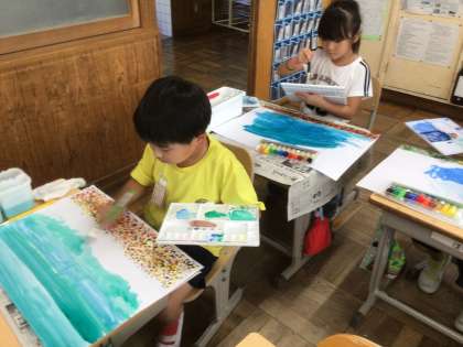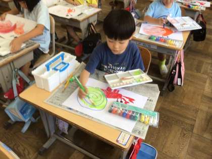 「ヤドカリのおひっこし」の読書感想画を描いています。この日は、主人公のヤドカリと、ヤドカリが