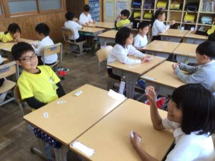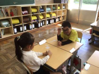 繰り上がりのあるたし算の名人になるために、たし算カードを使って計算練習をしています。今日は、ペアでゲームをして楽しみながら計算練習をしました。