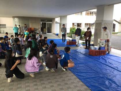 飯野ひかり幼稚園の年長さんもゲストに招いて一緒にもみすりを行いました。