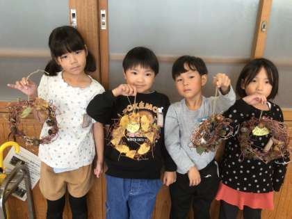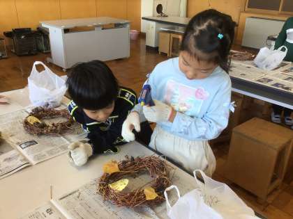 10/30 1年 生活 リースの飾り付け 公開日 2025/11/02 更新日 2025/11/02 第1学年の様子 学校の運動場で見つけた秋の木の実や葉っぱを使って、あさがおリースの飾り付けをしました。グルーガンを使って貼り付けていきます。それぞれのセンスで素敵なリースが完成しました。 1年