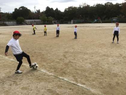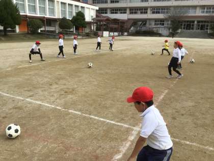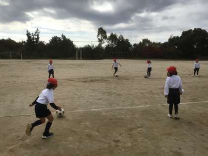 体育の授業では、ボール蹴り遊びがスタートしました。まずは、足でボールを蹴ったり止めたりすることに慣れることから始めています。慣れていないので、ついつい手で触ってしまいます。