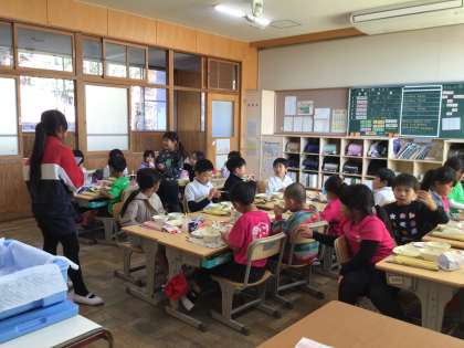 給食の時間に、運営委員会の5年生から「赤い羽根共同募金」について連絡がありました。2年生のみんなはしっかり話を聞いて、たくさん質問をしていました。